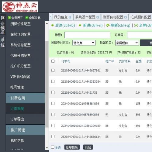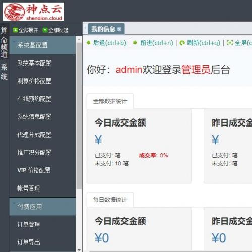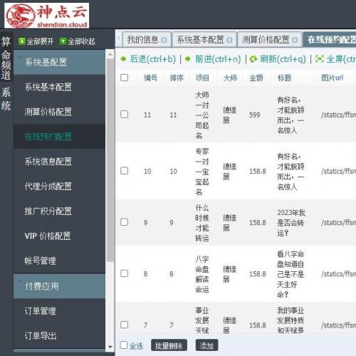 1、系统配置:系统基本配置、测算价格配置、在线预约配置、系统信息配置、代理分成配置、推广积分配置、VIP价格配置、账号管理